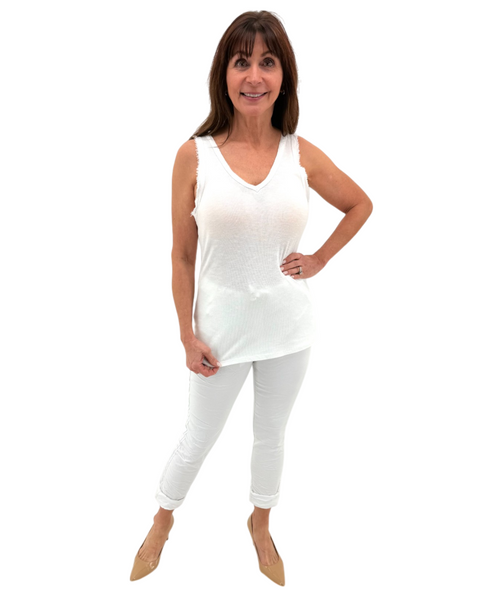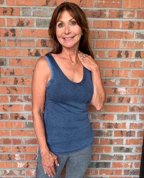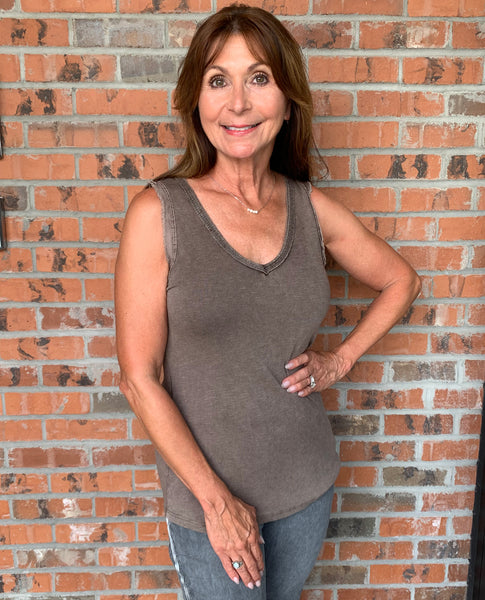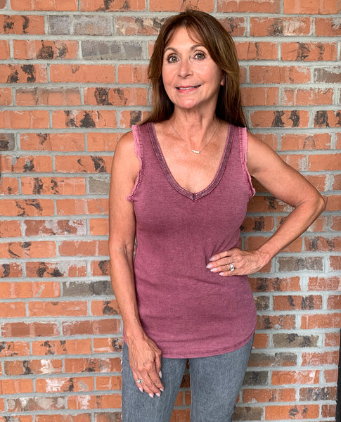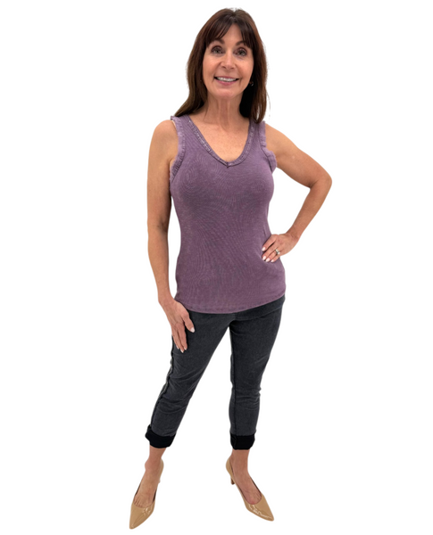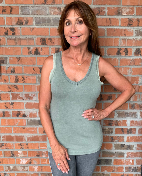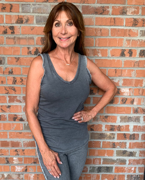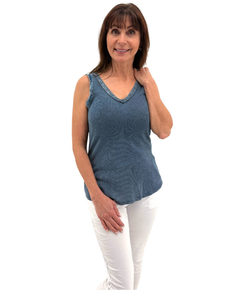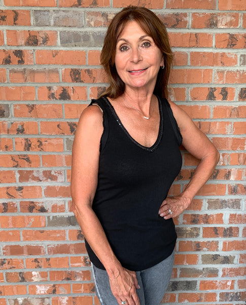 Tank tops are an essential summer piece, and this one is extra fun with a tone-on-tone sequin-trimmed neckline. Raw edging at the armholes keep the look casual, and the mineral washed fabric adds to the laidback look.