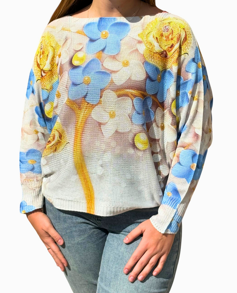 Bring a touch of artistry to your wardrobe with this Italian-made sweater, featuring a beautifully designed flowering tree motif that feels both whimsical and sophisticated. Crafted from a soft, high-quality knit, it blends comfort with standout style. The vibrant design pops against the cozy backdrop, while ribbed cuffs, hem, and neckline add a refined finish.