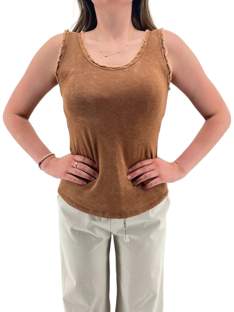This raw edge tank is a cute option to wear under a sweater, blazer, or jacket, or even to wear alone. The armholes and the scoop front and back necklines are trimmed with a frayed detail.