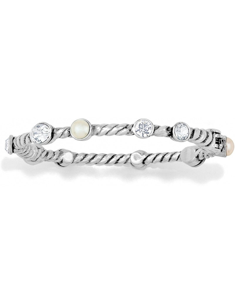 This silver bangle bracelet features a rich looking mix of stones and pearls that looks great alone or stacked.