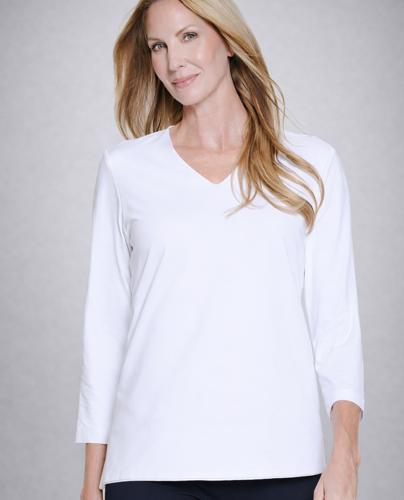 Elevate your everyday wardrobe with this versatile three-quarter sleeve v-neck top from MULTIPLES. The classic v-neckline flatters various body types while the three-quarter sleeves offer the perfect balance between coverage and breathability. Crafted for comfort and style, this piece transitions seamlessly from casual days to dressed-up occasions. Whether you're layering it under a blazer or wearing it solo, this timeless top is designed to become a go-to favorite in your closet. A wardrobe essential that works as hard as you do.