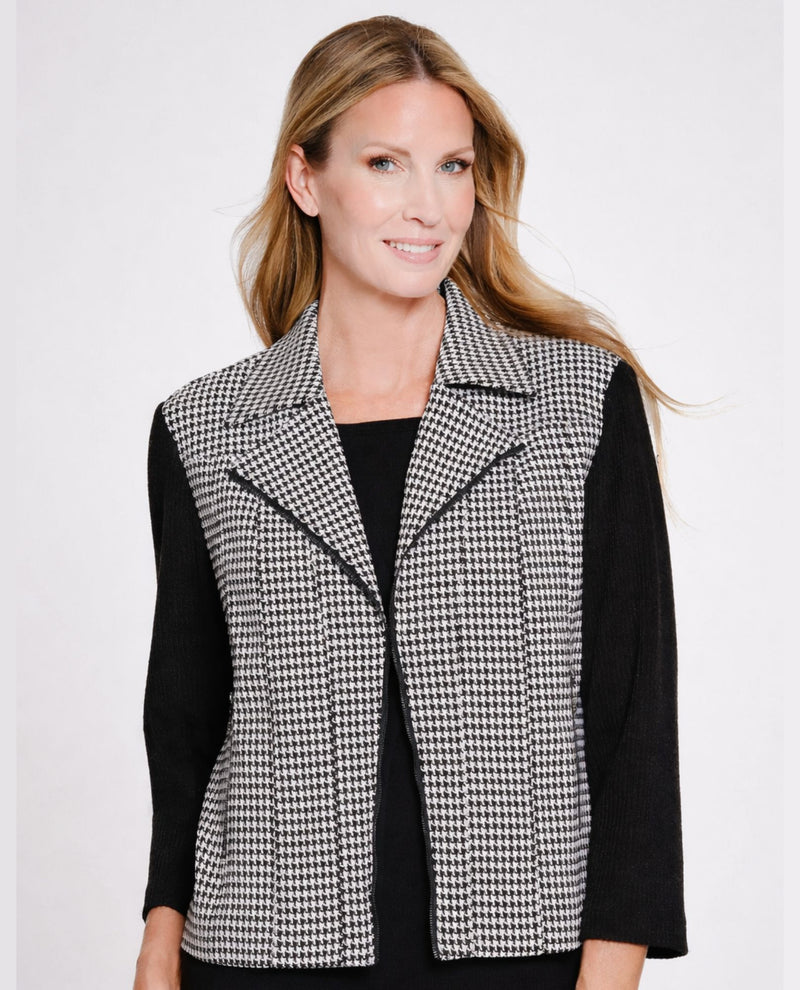 Tailored with a modern edge, this open-front knit jacket blends classic menswear influence with contemporary ease. A lapel collar and hook-and-eye closure create clean structure, while faux zip-front and faux zip pocket details add sleek, streamlined appeal. Finished with 3/4-length sleeves and solid rib knit accents, it’s crafted in a comfortable poly-blend with stretch for polished layering that moves effortlessly from day to evening.
