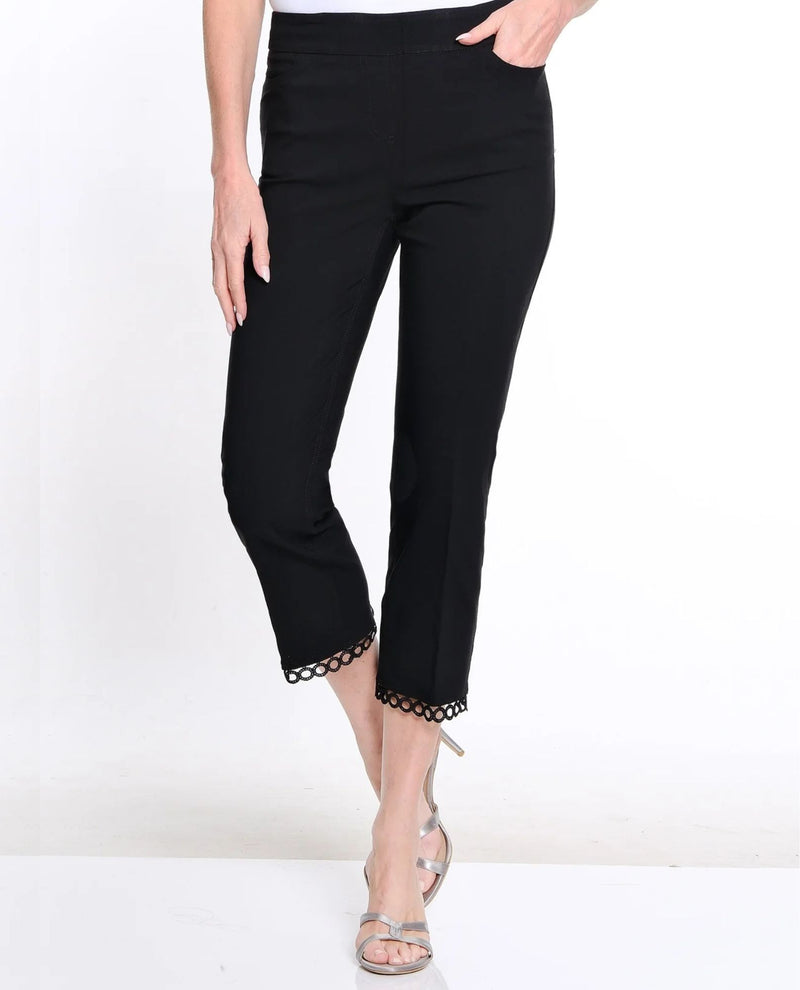 Effortlessly polished with a feminine finish, this pull-on crop pant is crafted in smooth twill for a clean, refined look. Real front and back pockets add classic tailoring, while delicate lace trim at the hem introduces subtle romance. Designed in a comfortable rayon-nylon-spandex blend and boasting a hidden tummy control panel, it offers stretch and ease with a flattering, streamlined silhouette.