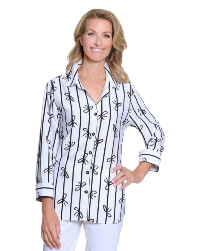 Add a playful yet polished touch to your wardrobe with this chic bow-print woven shirt. Designed with a lightweight rayon-nylon blend, it offers a soft feel and effortless drape. The 3/4 sleeves with turn-up cuffs add a stylish detail, while the button-front design ensures versatility for both casual and dressy looks.