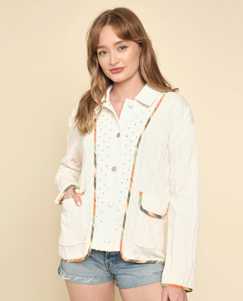 Expertly crafted for warmth and style, the MYSTREE 60057 SWEATER MIX TWOFER JACKET is the perfect addition to your wardrobe. Made with a mix of cozy sweater fabric and a classic button-down design, this jacket combines comfort and sophistication. The pockets with flaps add a practical touch, while the collared neckline adds a polished look.