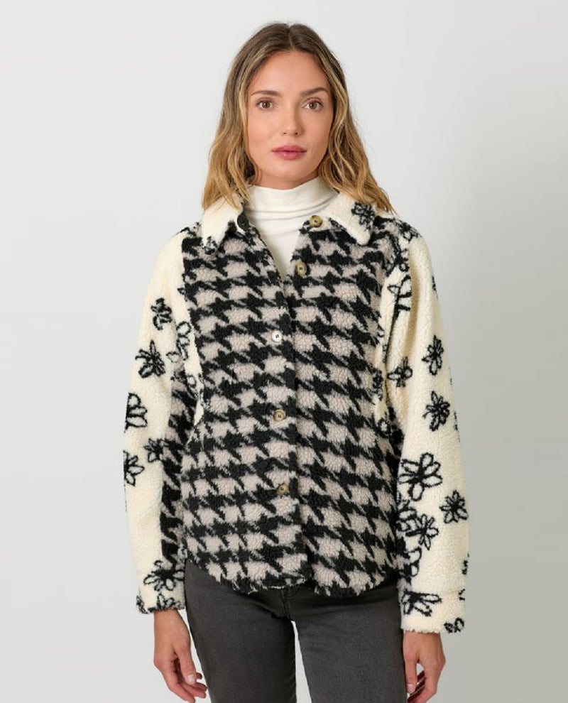 Stay cozy and stylish with the MYSTREE Color Block Button Down Jacket. This jacket features a striking color block design with printed fabrics in complimentary colors. For a shacket style, it features both a collar and a shirt tail hem. Perfect for casual outings or layering under a heavier coat, this cozy jacket combines functionality with a modern look.
