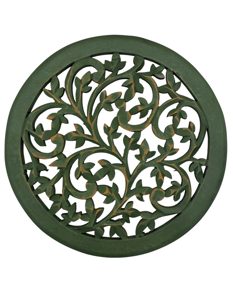 This set of two natural wood carved round trivets combine functionality with decorative charm. Each 8x8" piece is beautifully carved, offering a unique accent that can protect your surfaces from hot dishes or easily be showcased as wall décor or on a plate stand. These trivets bring a warm, organic touch to any home.