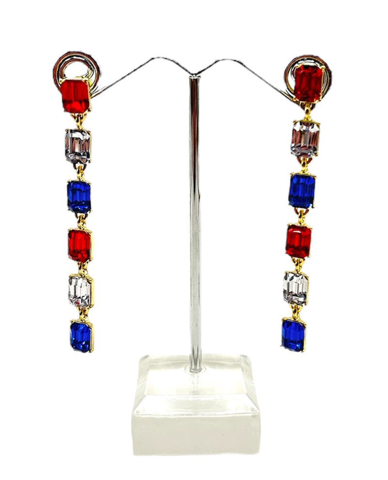 These vibrant red, white, and blue dangle earrings are the perfect statement piece for any patriotic occasion. Add a touch of color and flair to your outfit and show off your American pride with these eye-catching earrings.