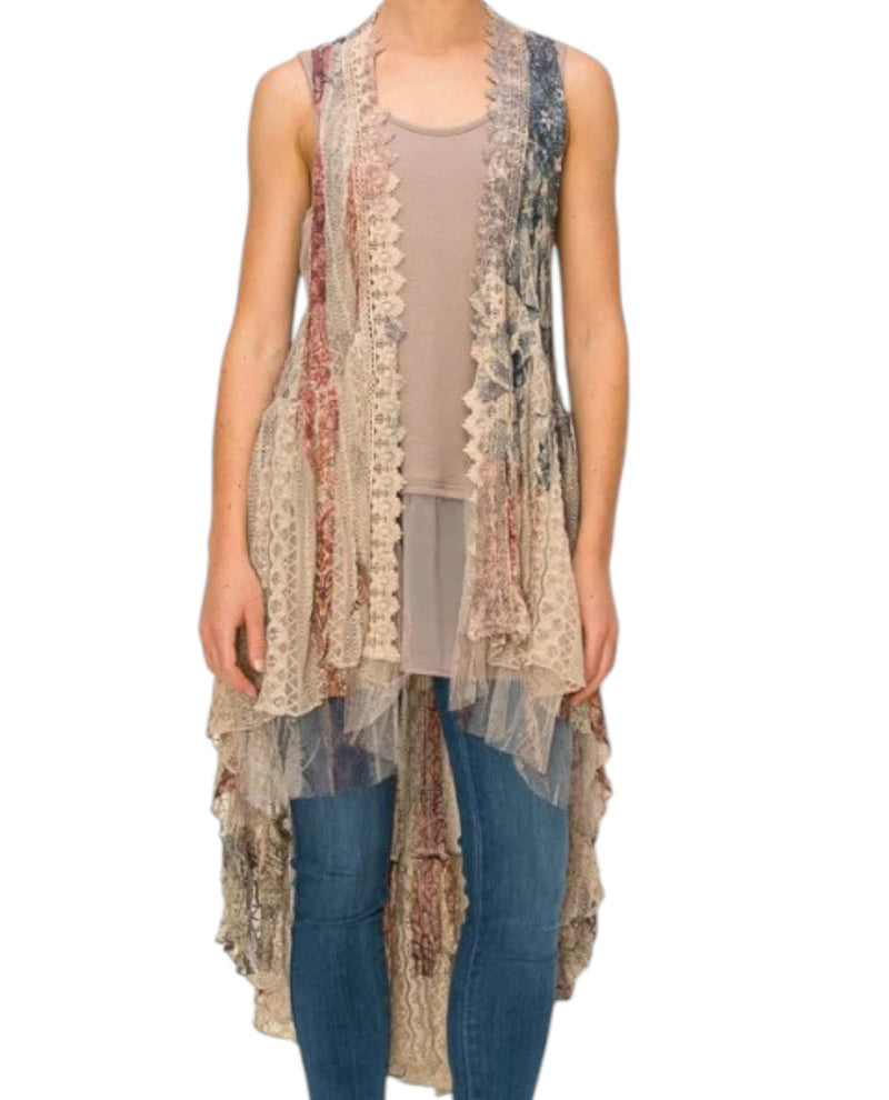 Celebrate your patriotic spirit with this stunning vintage-inspired lace vest featuring a bold flag print. Its high-low design adds a flattering, modern touch, making it a versatile piece that pairs beautifully with denim for a casual look or a lace top for added elegance. Perfect for showing your pride in style and comfort.