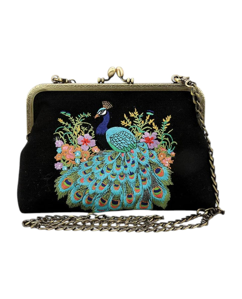 This Vibrant Peacock Kisslock Bag showcases exquisite embroidery that adds a touch of luxury and artistic flair to your accessory collection. Designed for versatility, it includes both a sturdy handbag strap and a detachable chain crossbody strap, letting you easily adapt your look from casual to elegant. Perfect for boutique shoppers seeking a unique, handcrafted piece that stands out with vintage charm and intricate detail. Elevate your style with this beautifully crafted bag that merges timeless design with practical wearability.