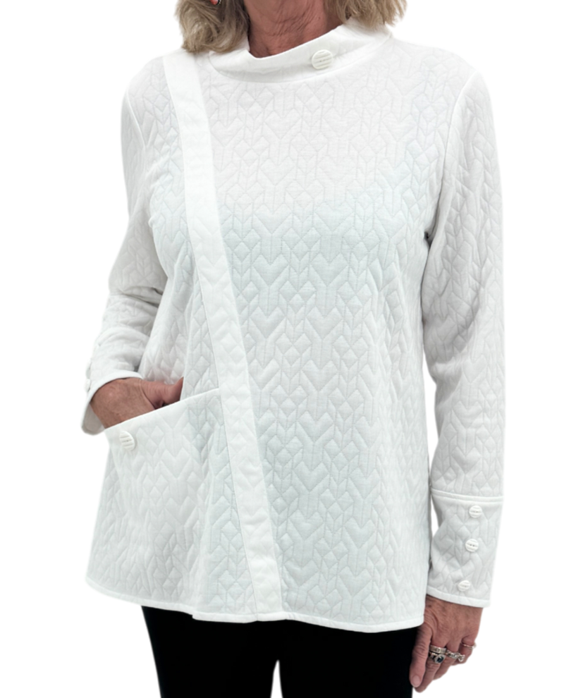 The PURE ESSENCE Textured Tunic offers a comfortable and stylish option for your everyday wardrobe. Crafted with a quilted textured fabric, this tunic adds subtle depth and interest to your look. Its relaxed fit ensures ease of movement, making it perfect for casual outings or layering. For extra flair, an asymmetric strip and an asymmetric front pocket add interest. Embrace a versatile piece that combines comfort with understated elegance for all-day wear.
