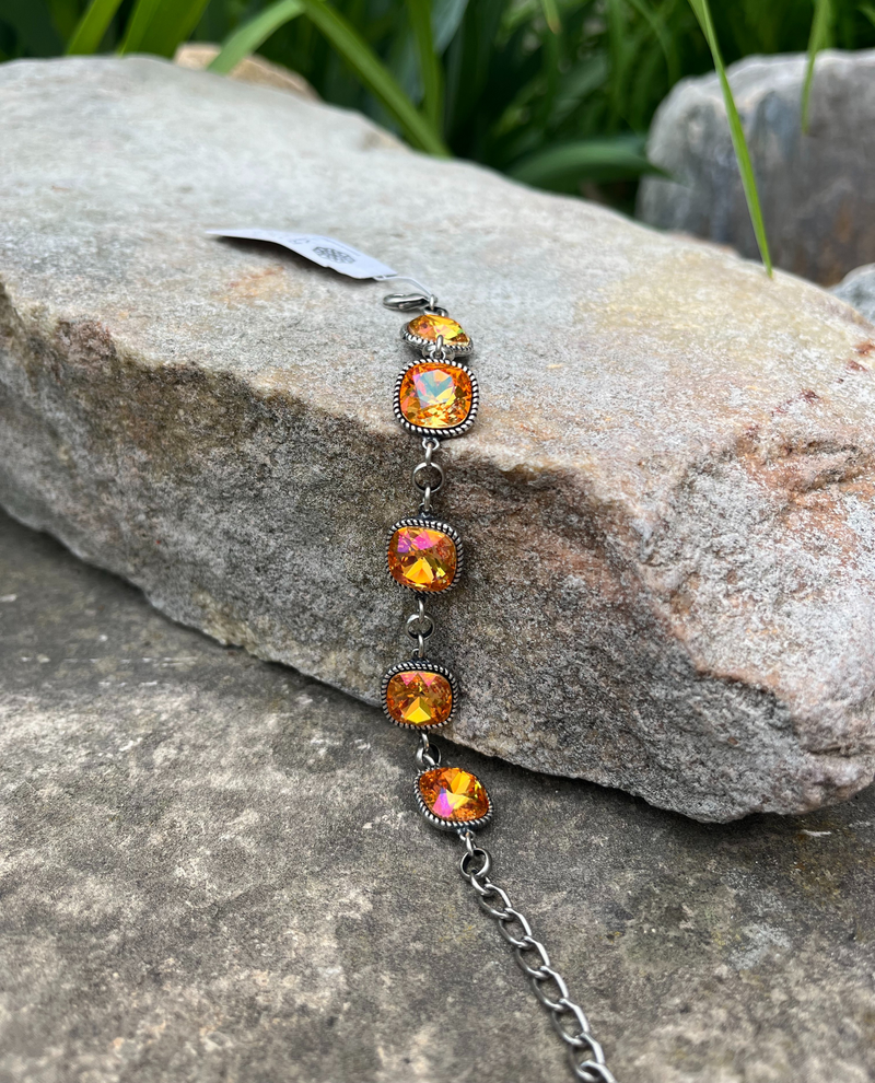 Rachel Marie pieces are locally made in Michigan using Swarovski crystals, as well as lead and nickel-free materials. In order to preserve the item at its highest quality, avoid direct contact with water, moisturizing creams, or perfume. This special piece is to be the last item you put on before leaving the house.Live in sparkle. USA Made.