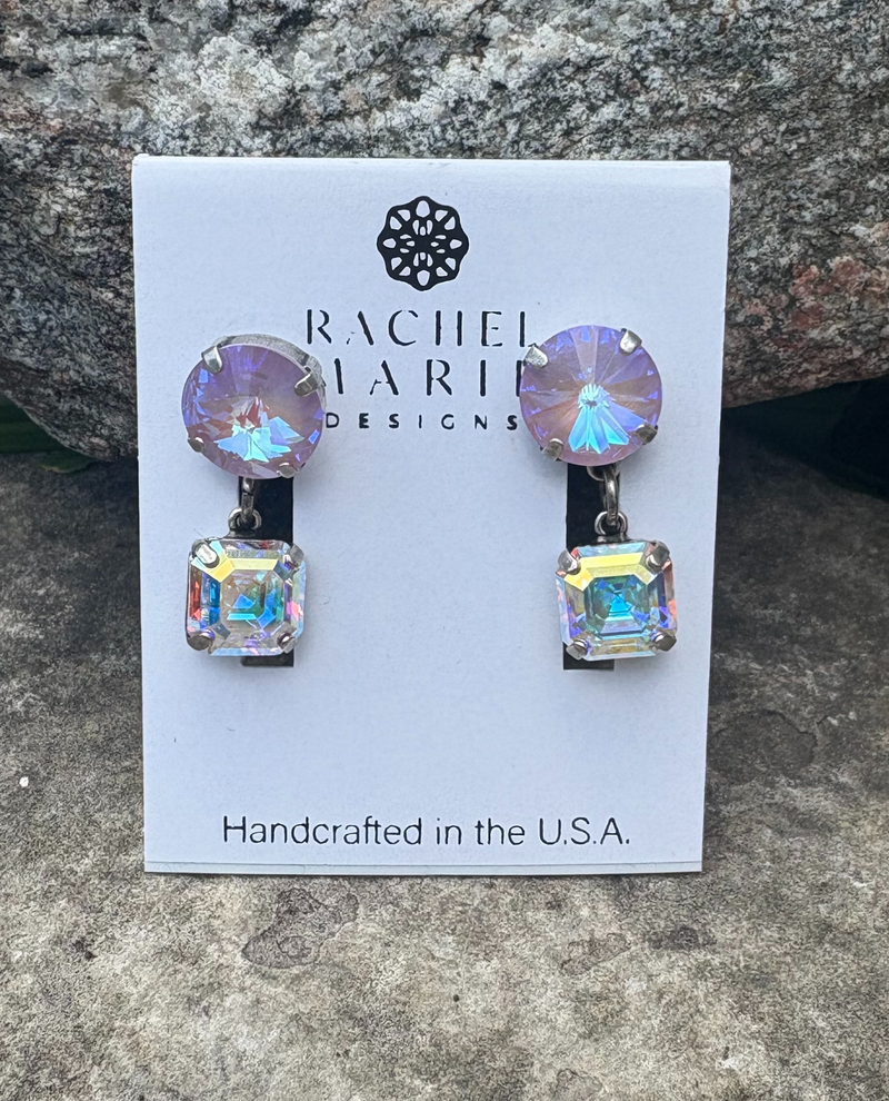What a great duo! These Rachel Marie Designs earrings feature two pretty crystals in complementary colors, one with a round shape and one with a square shape.