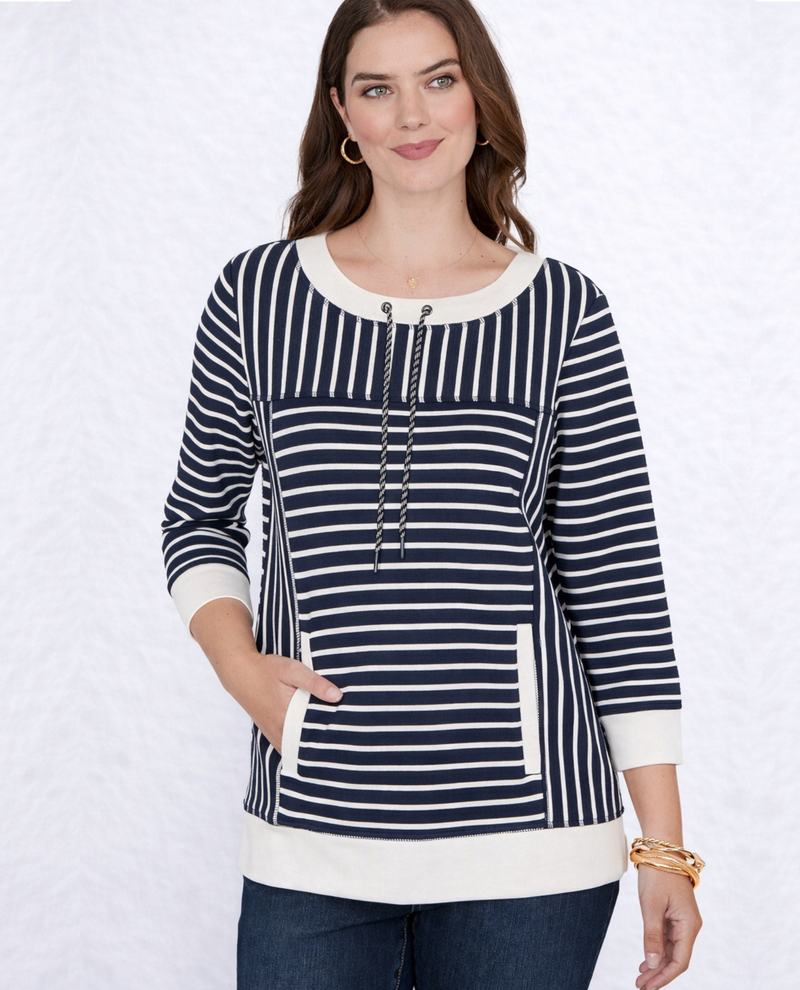 This textured popover blends casual comfort with polished detail. Designed in yarn-dyed ottoman stripe with contrast trim, it features a drawstring neckline, 3/4 sleeves, and front patch pockets for an easygoing, modern look.