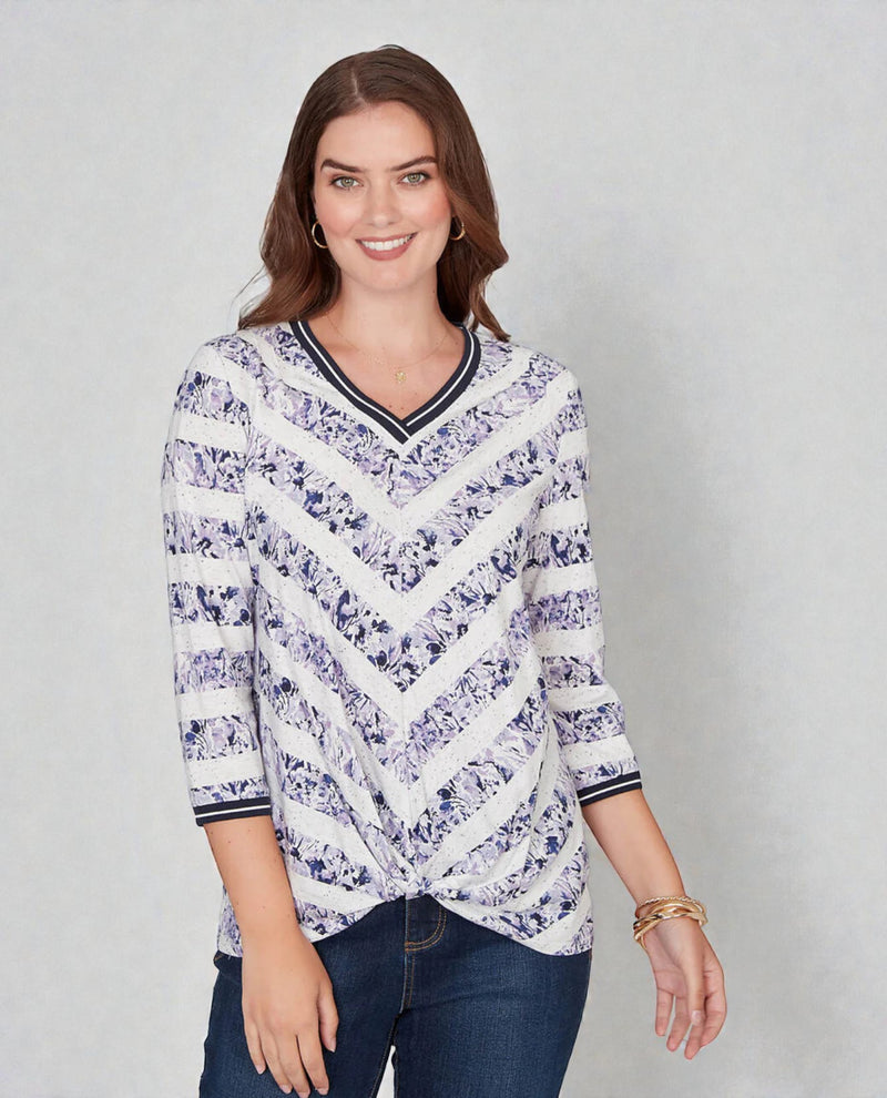 A playful take on pattern and texture, this printed fleck jersey top features mitered floral stripes and a flattering twist front hem. Finished with 3/4 sleeves and sporty contrast tipping, it's perfect for days when you want to feel comfortable, stylish and effortlessly pulled together.
