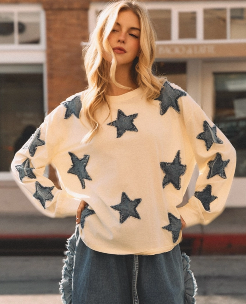 # SAGE & FIG ST8057 MIDNIGHT COMET APPLIQUE TOP Elevate your wardrobe with this striking applique top from Sage & Fig. The Midnight Comet design features eye-catching embellished detailing that adds dimension and personality to your everyday style. Crafted with quality construction, this piece works beautifully as a standalone statement or layered with your favorite pieces. Perfect for those moments when you want to feel confident and put-together, this top brings a touch of sophistication to casual or dressed-up looks.