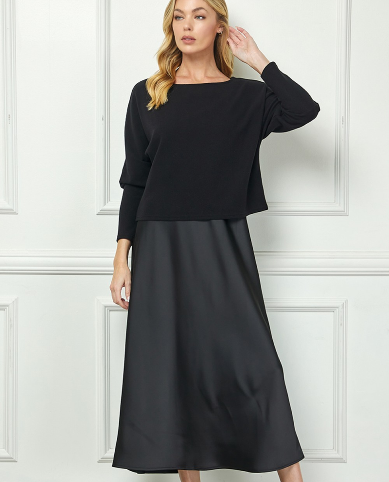 Elevate your wardrobe with this versatile two-piece set that effortlessly transitions from day to night. The cozy knit top pairs beautifully with the silky satin slip dress, giving you endless styling possibilities in one coordinated package. Layer them together for a polished, put-together look, or wear each piece separately to maximize your outfit options. Perfect for someone who values both comfort and style, this set makes getting dressed easier while keeping you looking absolutely fabulous.