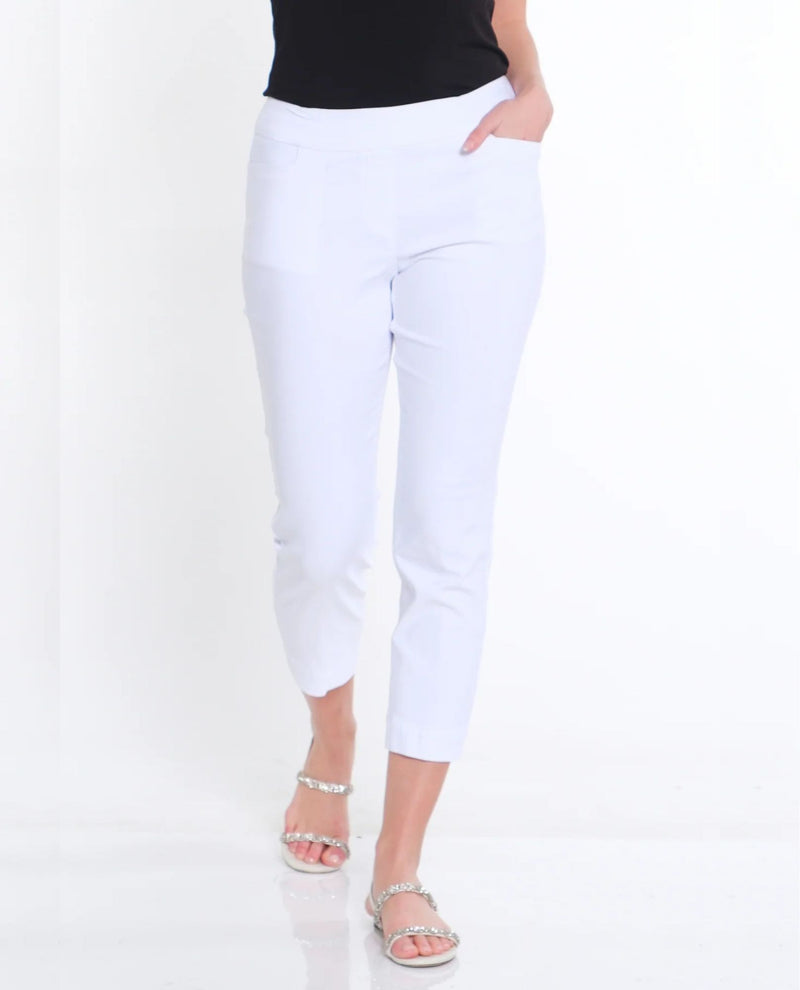Effortlessly polished and endlessly comfortable, these pull-on crop pants are crafted from fine line twill with a soft, stretchy feel. Designed with real front and back pockets for everyday function, they feature a flattering crop length with a 26" inseam and 14" leg opening. The rayon-nylon-spandex blend offers a sleek fit that moves with you from day to night.