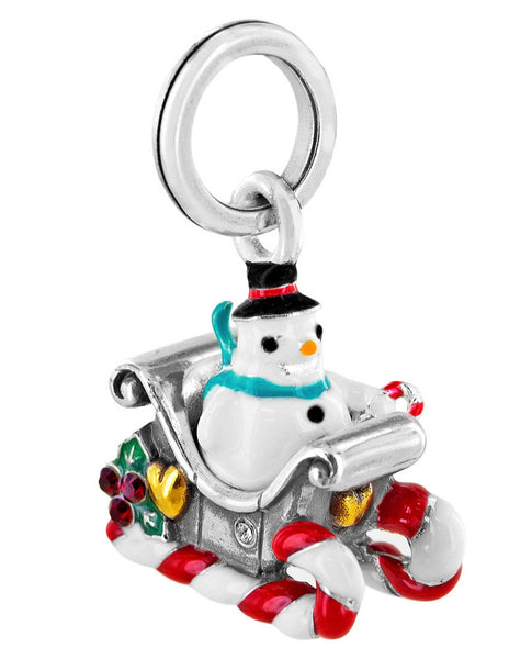This adorable hand-enameled snowman sits in a candy cane sleigh, ready to slide on to your Christmas charm jewelry.Â