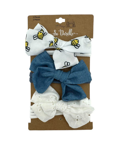 This 3 piece baby headband set includes a bumble bee hair bow, a denim hair bow, and a white lace hair bow. These stylish and versatile accessories will add a touch of cuteness and charm to your little one's outfit. Made with quality materials, they are both comfortable and durable.