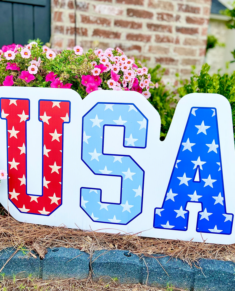 Artwork is custom and digitally painted. This garden stake is 32” wide and printed 1-sided on corrugated board. It’s durable and should last for years! It comes with a set 12” stakes