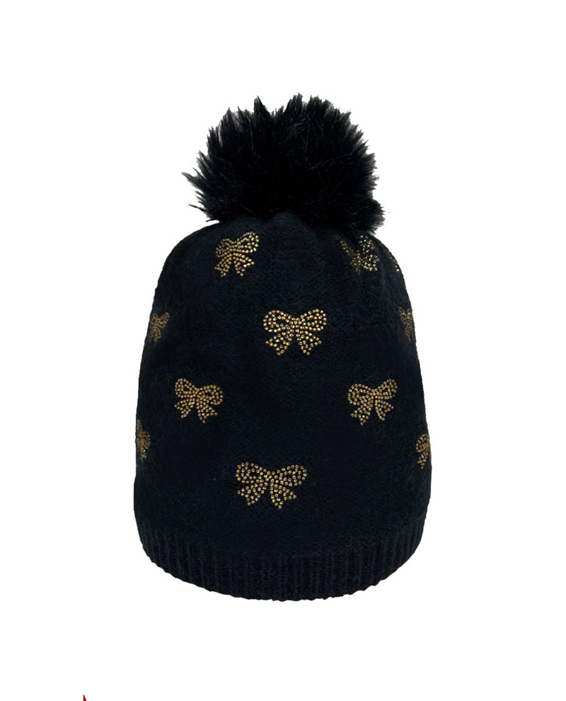 Stay cozy and stylish with the Sparkling Bow Beanie by Mirabeau. Fully lined with soft fleece, this beanie ensures warmth and comfort on chilly days. Tiny crystals form charming bows scattered across the hat, adding a delicate sparkle to your winter look. Perfect for those who want a touch of sweetness and elegance while staying snug.
