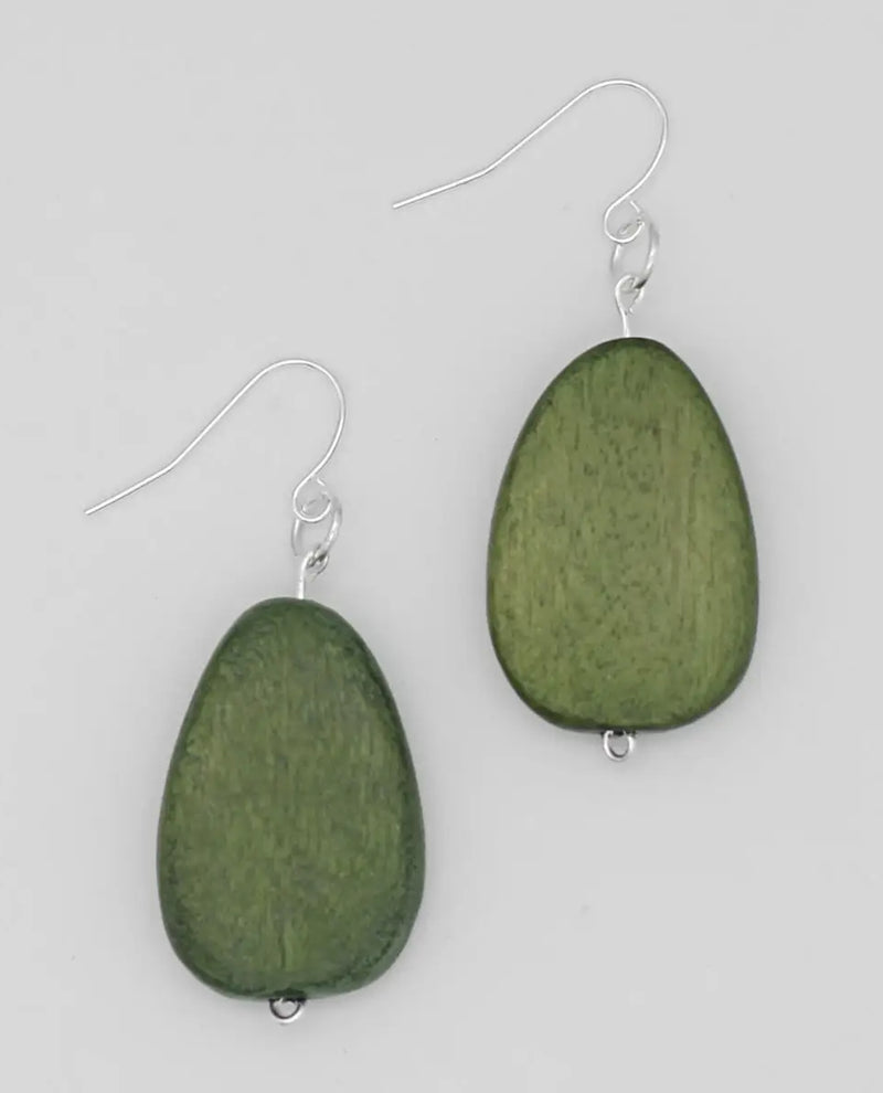 These fun forest green tear drop dangle earrings feature a wooden bead that dangle off a silver wire for a look that will surely stand out! Wear them without any other jewelry for an understated look, or pair them with a coordinating statement necklace for a more complex, accessorized expression! The earrings are about 2 inches long, and the hook is silver plated.