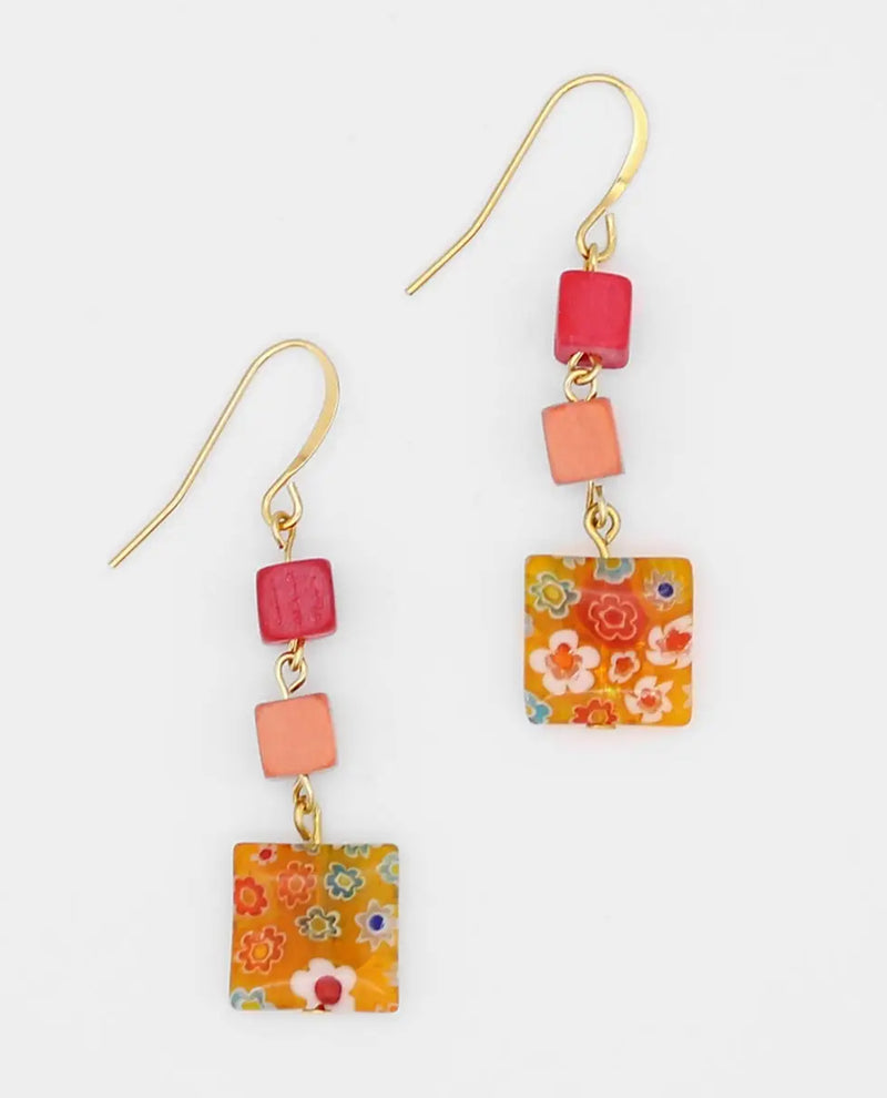 Handmade in house; these floral drop earrings will be your new go-to! Two tiny wood beads hang along side a peach floral bead on a gold plated french hook.