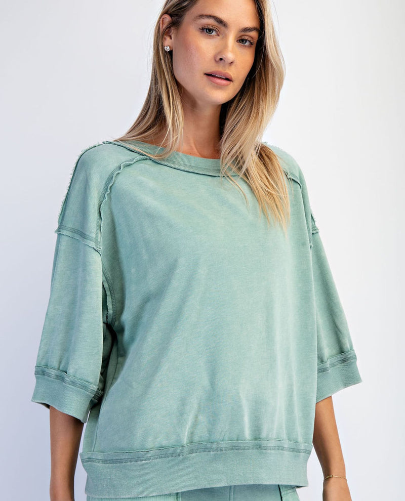 Elevate your everyday wardrobe with this versatile French Terry short sleeve top. Crafted from soft, breathable fabric, it offers the perfect balance of comfort and style for any occasion. Whether you're running errands or relaxing at home, this piece adapts effortlessly to your lifestyle. The relaxed fit flatters all body types, while the quality construction ensures it'll remain a go-to favorite season after season.