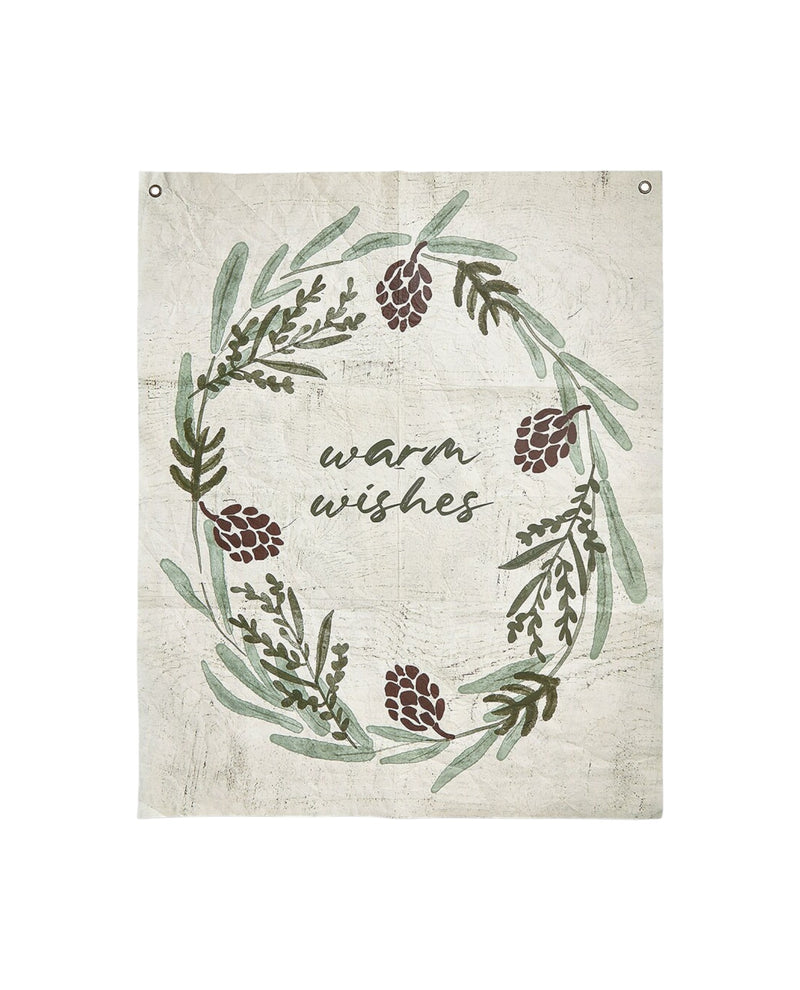 This 26x32" warm wishes wall art features a charming wreath motif printed on durable, chic paper. Designed with metal grommets in each corner, it’s easy to hang and adds a welcoming, heartfelt touch to any room. Perfect for creating an inviting atmosphere filled with warmth and positivity. G15758