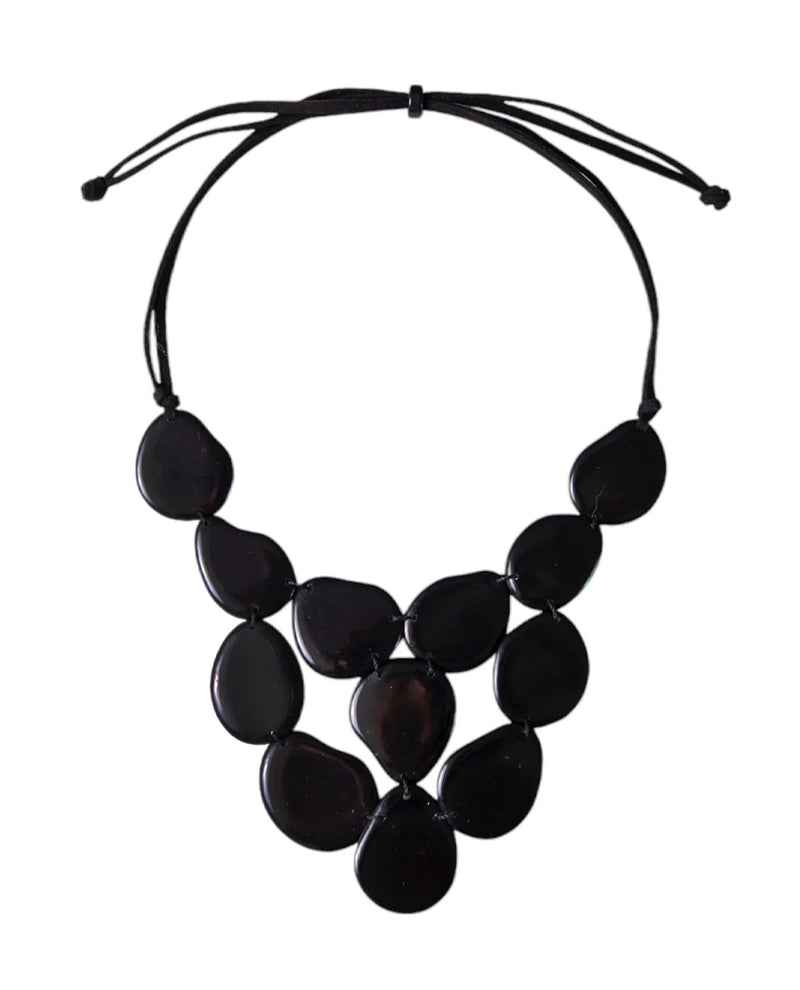 Experience elegance and sustainability with the beloved Waterfall Necklace. Handmade in Ecuador with sustainable Tagua nuts and organic vegetable dyes, this adjustable 18"-38" L necklace features cascading tagua slices on a faux leather cord. Enjoy the natural beauty of Tagua in a versatile design.