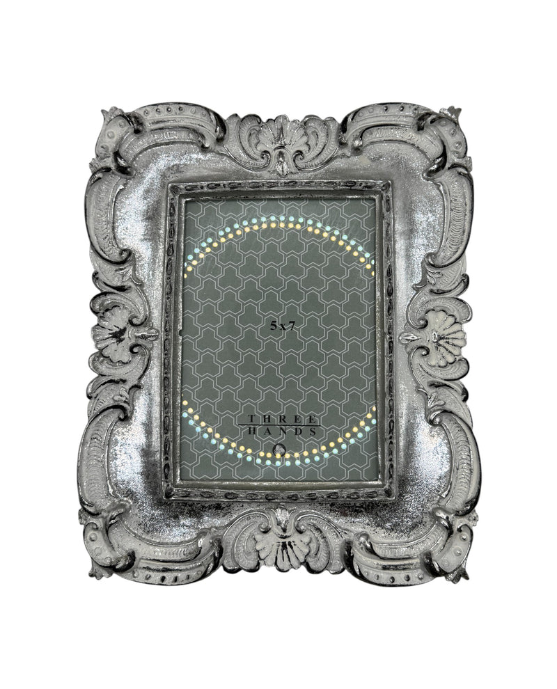The Three Hands ornate tabletop picture frame features a silver and white Victorian-inspired resin design that brings elegance to any space. Measuring 8.5 by 10 inches on the outside, it includes a glass cover and fits a 5x7-inch photo perfectly. This frame is ideal for displaying cherished memories with a classic touch, adding both beauty and protection to your favorite pictures.