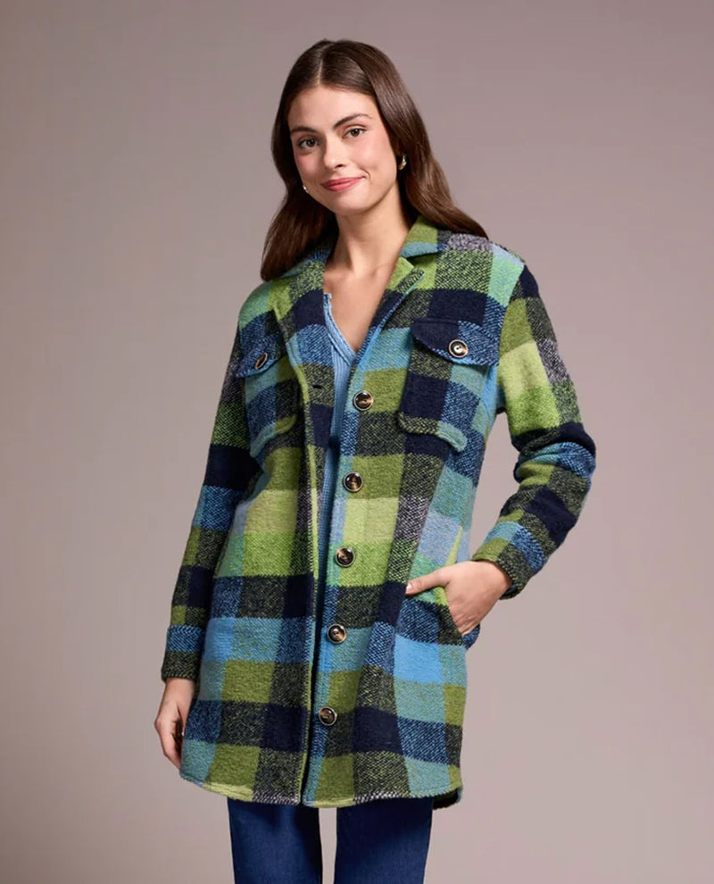 Transform your look with this classic knit shacket, featuring a bold plaid pattern and distinctive novelty buttons. The long silhouette offers ample coverage, keeping you cozy as the weather cools, while the notched lapels add a touch of refined detail, effortlessly enhancing your ensemble with understated elegance.