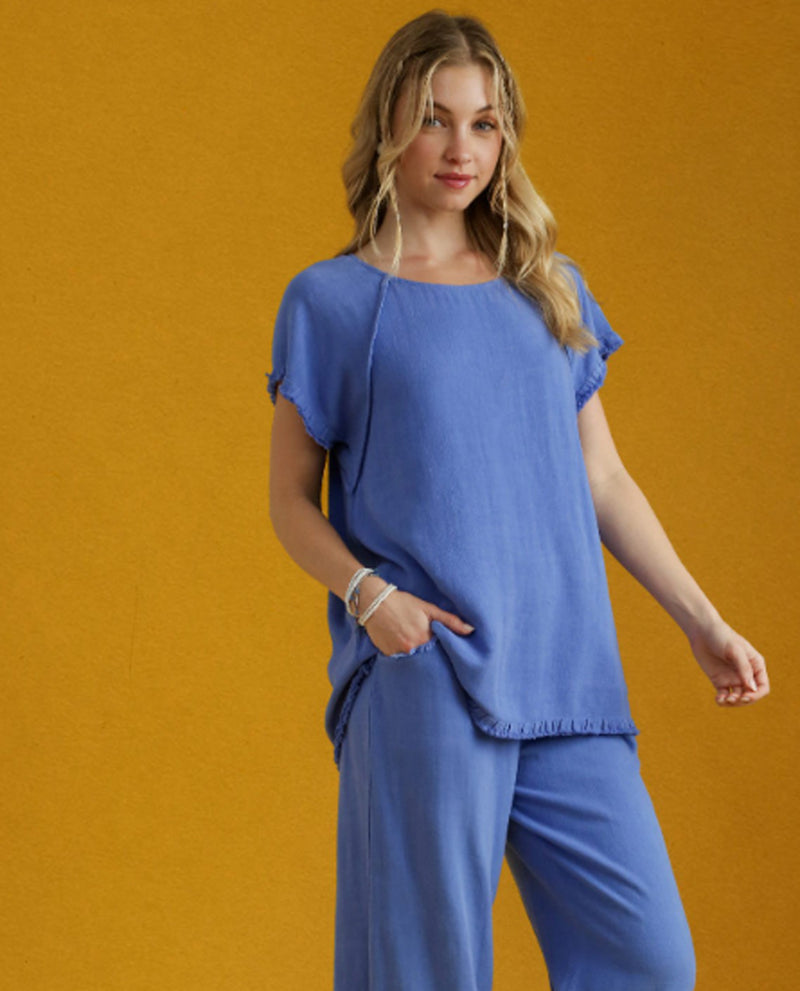 Solid Linen Short Sleeve Top Featured Seam and Ruffle Fringe EdgesFit & Model Notes:• Model is 5'9" and is wearing a small.• All Measurements are approximate.Fabric Contents:• 55% Linen• 45% Cotton
