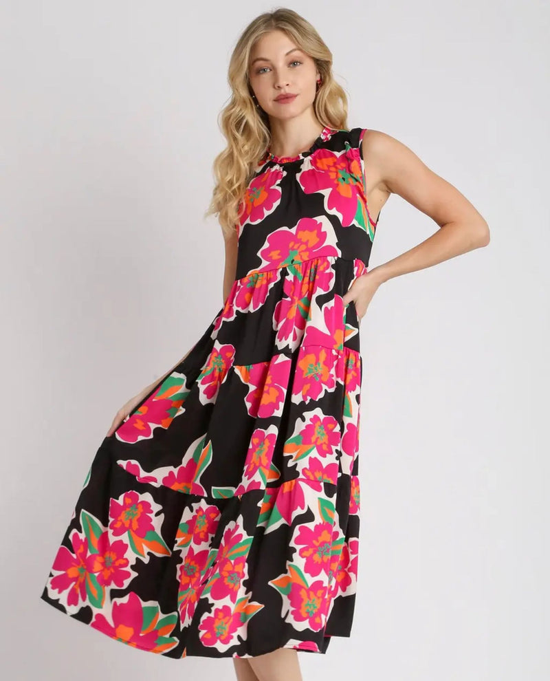 Embrace effortless elegance with this stunning sleeveless tiered floral maxi dress from UMGEE. The cascading tiers create beautiful movement and dimension, while the bold floral print adds a feminine touch. Perfect for warm-weather occasions, this dress offers a flattering silhouette that transitions seamlessly from daytime gatherings to evening events. A high neckline in front and back provides modesty, and a keyhole back with button allows for on/off. Whether you're attending a garden party or enjoying a casual outing, this versatile piece lets you express your personal style with confidence and grace. Note that this piece runs roomy.