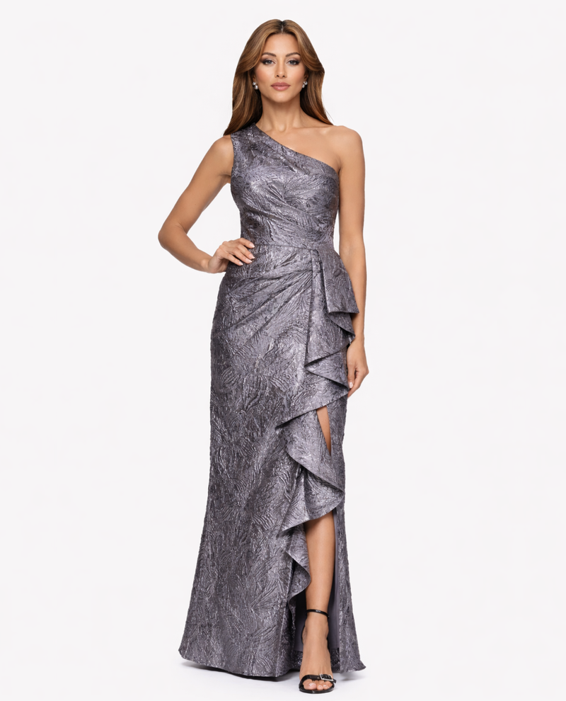 Make a stunning entrance in this XSCAPE jacquard gown, designed to turn heads at any formal occasion. The elegant one-shoulder neckline creates a sophisticated silhouette, while the floor-length cut offers timeless glamour. Crafted from luxurious jacquard fabric, this dress drapes beautifully and provides the structure you need to feel confident and radiant. Perfect for galas, weddings, or evening events, this gown combines modern design with classic elegance. You'll feel absolutely gorgeous from the moment you put it on.